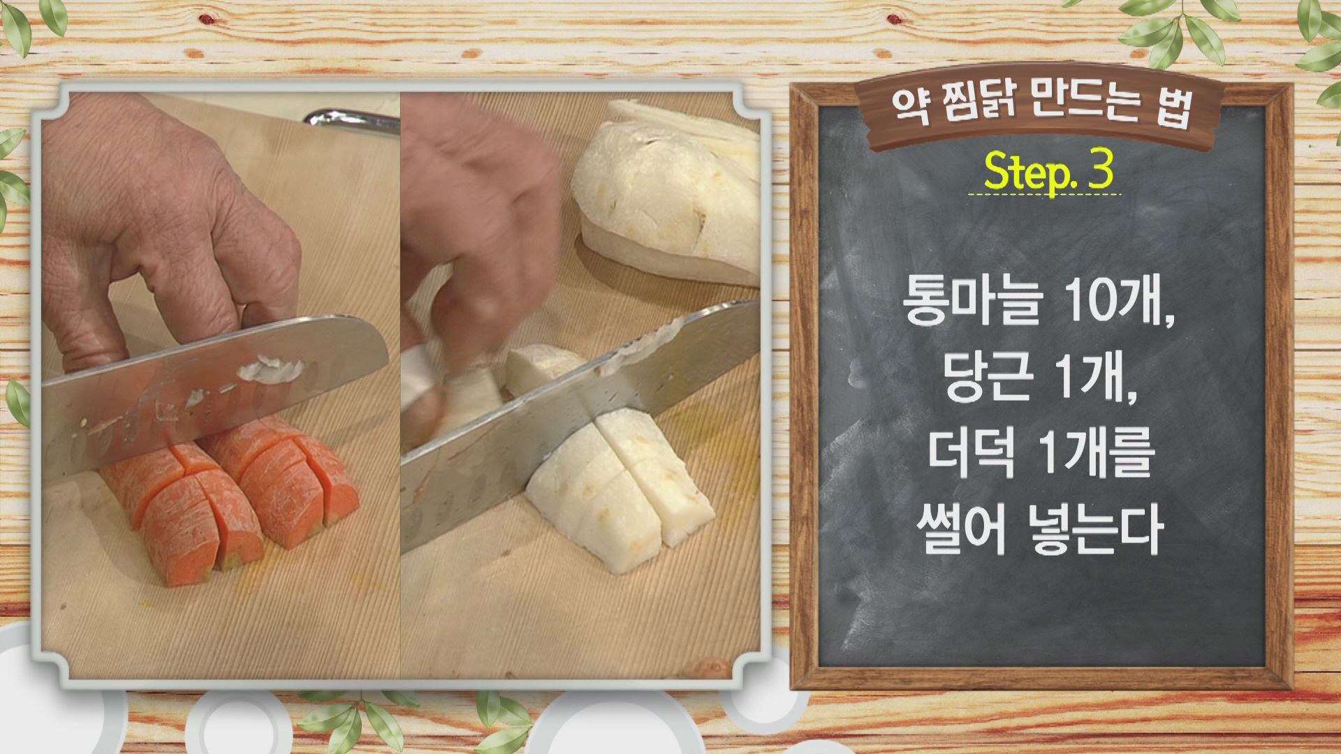 황기, 도라지, 생강, 헛개나무, 엄나무, 닭1마리, 마1개, 깐 생밤 10알, 돼지감자 5알, 통마늘10개, 당근1개, 더덕1개, 약수 1.5리터, 대파, 홍고추, 청고추, 양파, 식용유 2큰술, 간장 5큰술, 들깻가루 적당량