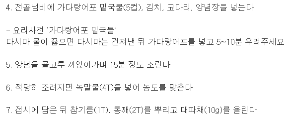코다리 620g, 김치 660g, 가다랑어포 밑국물 5컵, 녹말물 4t, 참기름 1t, 통깨 2t, 대파채 10g