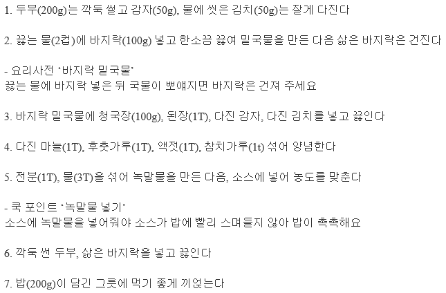 두부 200g, 감자 50g, 김치 50g, 물 2컵, 바지락 100g, 청국장 100g, 된장 1t, 다진마늘 1t, 후춧가루 1t, 액젓 1t, 참치가루 1t, 전분 1t, 물 3t, 밥200g
