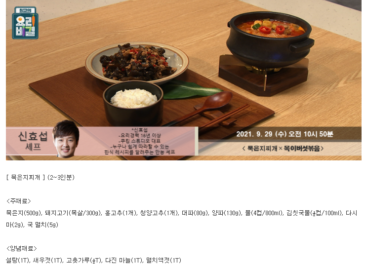 요리비결 신효섭의 묵은지찌개와 목이버섯볶음 레시피