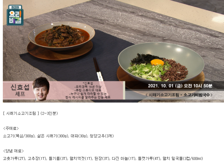 요리비결 신효섭의 시래기소고기조림과 소고기비빔국수 레시피