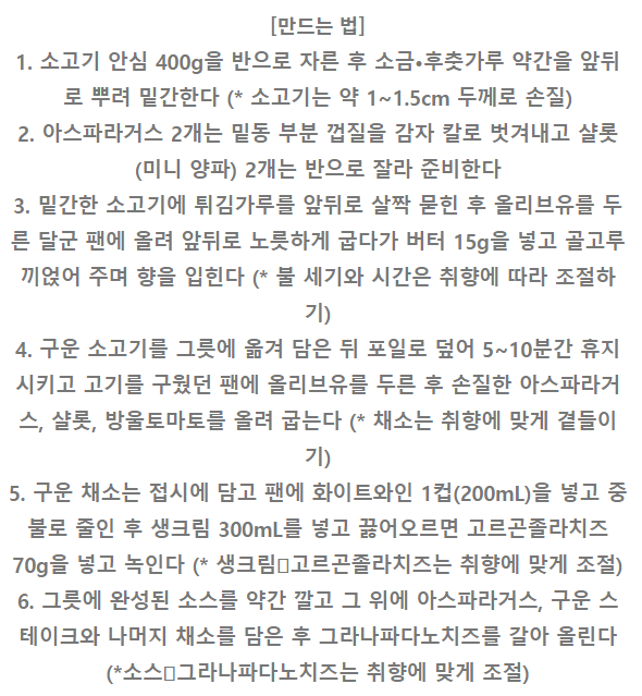 소고기 안심 400g, 소금 약간, 후춧가루 약간, 아스파라거스 2개, 샬롯 2개, 튀김가루 약간, 올리브유 적당량,