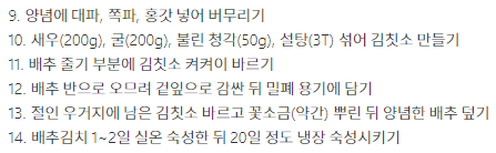 8. 고춧가루 400g, 멸치액젓 300g, 다시마 찹쌀풀 200g, 새우젓 국무루 1 1/4컵 250ml, 다진마늘 300g, 다진생강 5t,