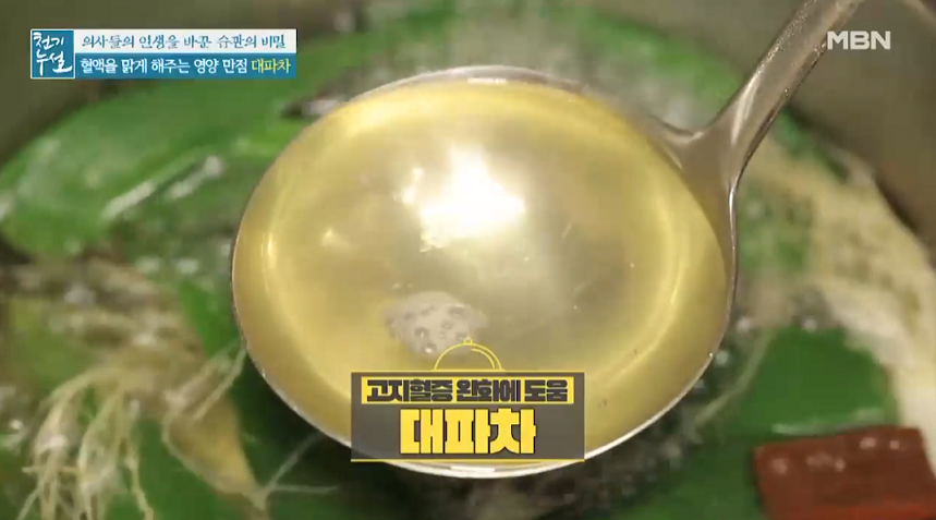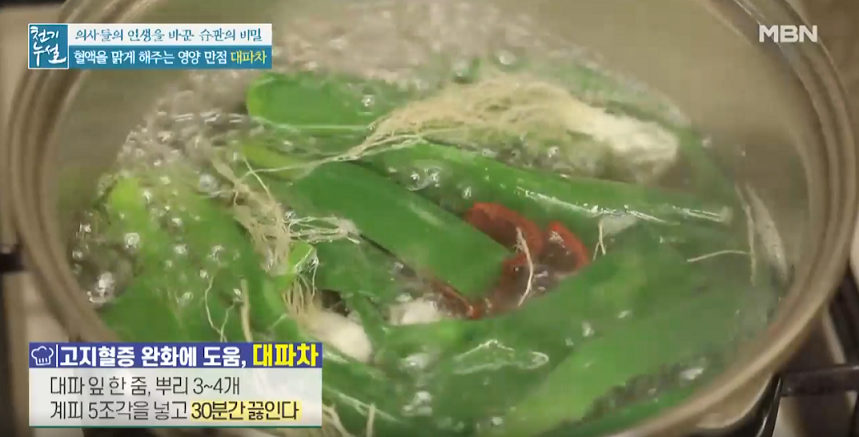 대파 잎 한 줌, 뿌리 3~4개 계피 5조각을 넣고 30분간 끓인다.