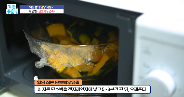2. 자른 단호박을 전자레인지에 넣고 5~8분간 찐 뒤, 으깨준다.