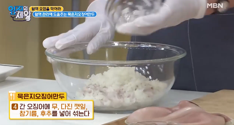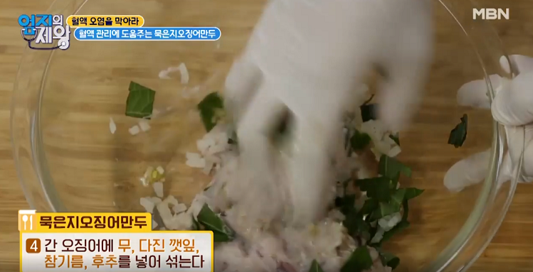 4. 간 오징어에 무, 다진깻잎, 참기름, 후추를 넣어 섞는다.