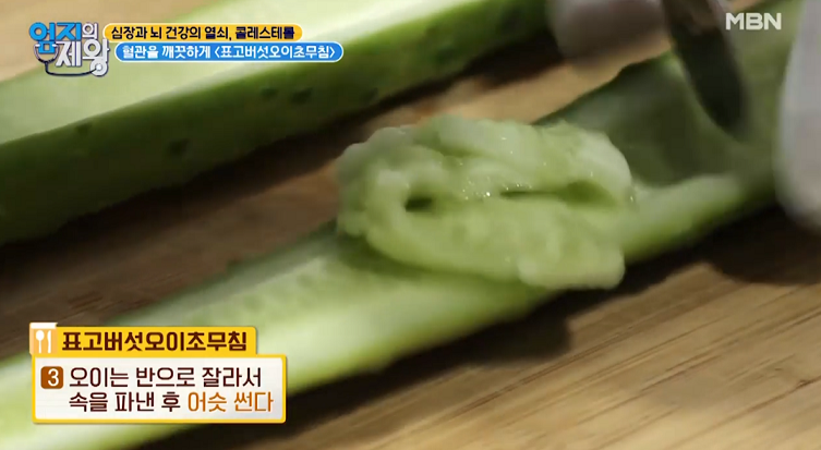 3. 오이는 반으로 잘라서 속을 파낸 후 어슷 썬다.