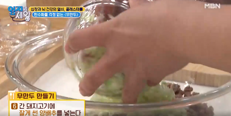 6. 간 돼지고기에 잘게 썬 양배추를 넣는다.