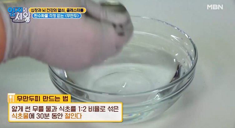 얇게 썬 무를 물과 식초를 1:2 비율로 섞은 식초물에 30분 동안 절인다.