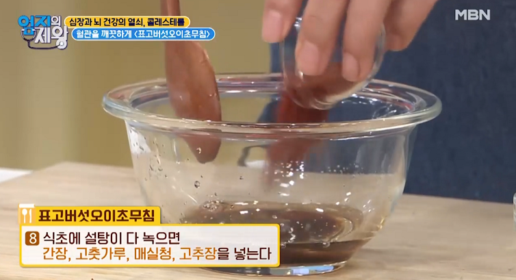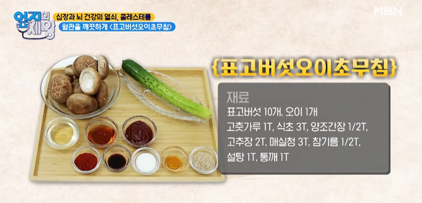 표고버섯 10개, 오이1개, 고춧가루 1t, 식초 3t, 양조간장 1/2t, 고추장 2t, 매실청 3t, 참기름 1/2t, 설탕1t, 통깨 1t