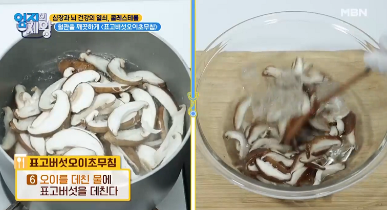 6. 오이를 데친 물에 표고버섯을 데친다.