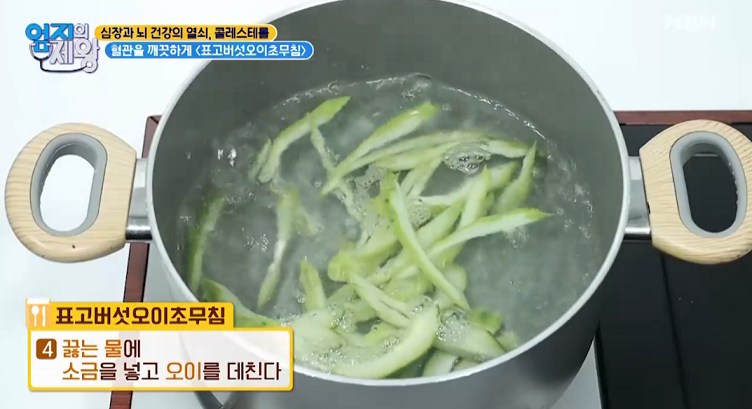 4. 끓는 물에 소금을 넣고 오이를 데친다.