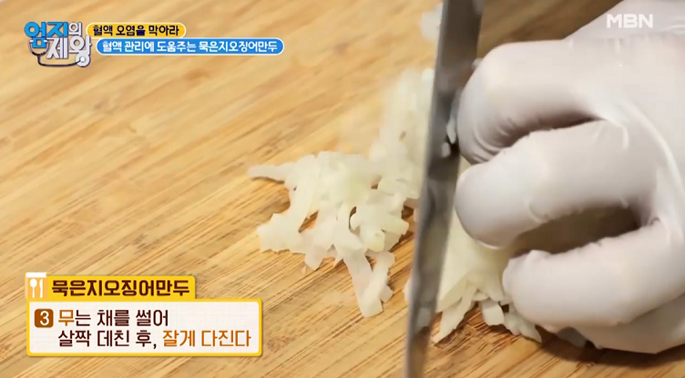 3. 무는 채를 썰어 살짝 데친 후 잘게 다진다.