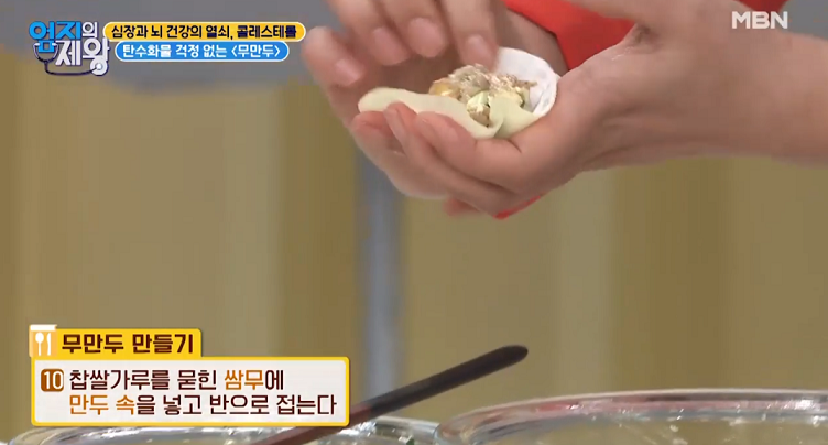10. 찹쌀가루를 묻힌 쌈무에 만두 속을 넣고 반으로 접는다.