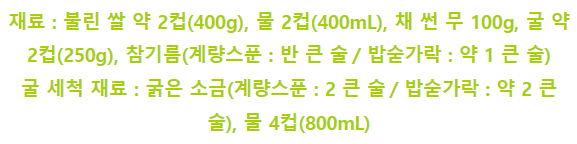 1. 뚝배기에 40분간 불린 쌀 약2컵 400g, 물2컵 400ml, 채 썬 무 100g을 넣고 물이 자작해질 때까지 뚜껑을 열고 센 불에 끓인다.