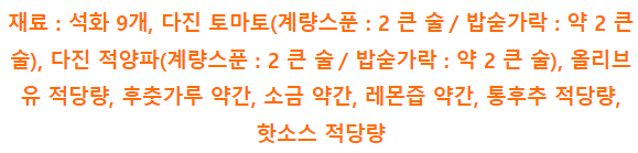 1. 볼에 껍질을 벗겨 다진 토마토 2큰술, 다진 적양파 2큰술, 올리브유 1큰술, 후춧가루 약간, 소금 약간, 레몬즙 약간을 넣고 섞는다.