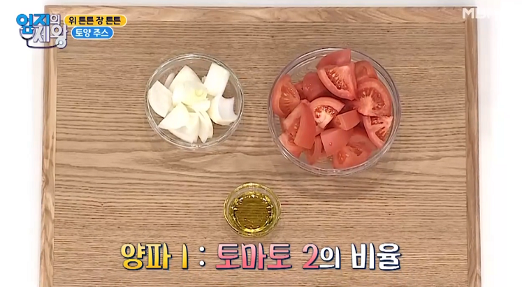 토마토 2개, 양파 1개, 올리브유 1숟가락