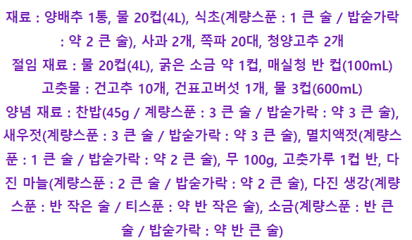 4. 물 20컵 4리터에 굵은 소금 약 1컵을 넣고 녹인 뒤 매실청 반 컵 100ml과 손질한 양배추를 넣고 1시간 절인다.