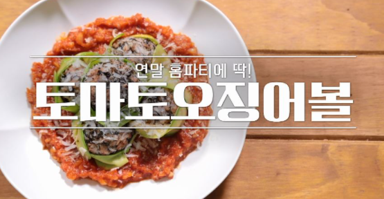 9. 토마토소스 위에 데친 애호박을 동그랗게 얹고 오징어볼을 올리고 그라나파다노 치즈를 뿌려준다.