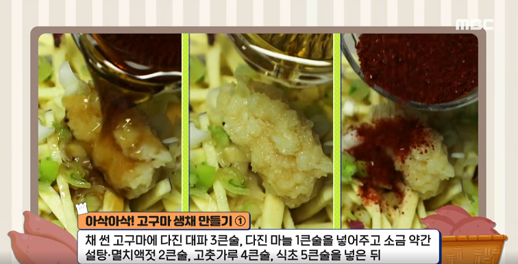 1. 채 썬 고구마에 다진 대파 3큰술, 다진마늘 1큰술을 넣어주고 소금약간, 설탕.멸치액젓2큰술, 고춧가루 4큰술, 식초 5큰술