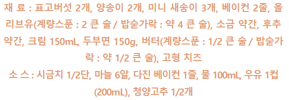 6. 팬에 썬 베이컨과 올리브유 2큰술, 버섯을 넣고 센 불로 볶다가 소금 한꼬집과 후추를 약간 넣고 볶은 베이컨과 버섯은 접시에 담아둔다.