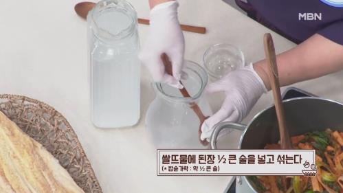 12. 쌀뜨물에 된장 1/2큰 술을 넣고 섞는다. 밥숟가락 약 1/2큰술