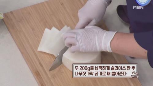 6. 무 200g을 납작하게 슬라이스 한 후 나무젓가락 굵기로 채 썰어준다.