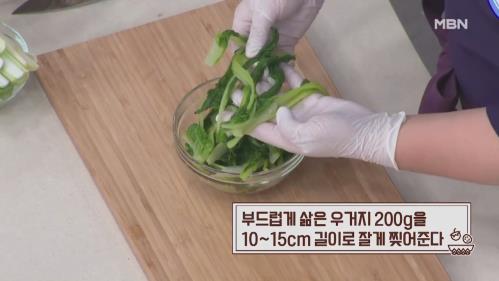 최고의 요리비결 최진흔의 코다리무조림과 배추바지락볶음 레시피 레시피를 알아보겠습니다. 만드는 방법 1. 배추 120g은 가장자리를 정리한 뒤 반 갈라 한 입 크기로 저미기 2. 홍고추 1개,