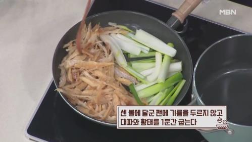 7. 센 불에 달군 팬에 기름을 두르지 않고 대파와 황태를 1분간 굽는다.