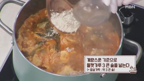 16. 계량스푼 기준으로 들깻가루 3큰 술을 넣는다. 밥숟가락 약 3큰 술