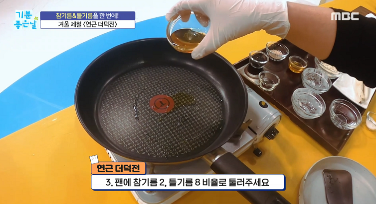 4. 팬에 참기름 2, 들기름 8 비율로 둘러준다.