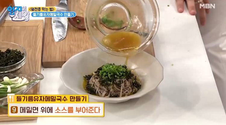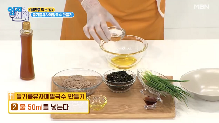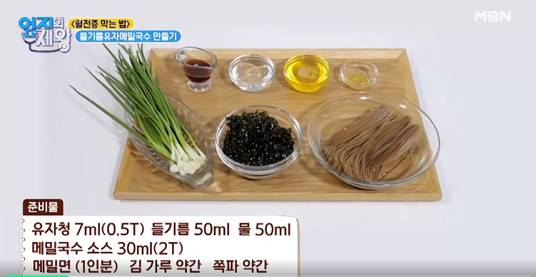 유자청 7ml(0.5t), 들기름 50ml, 물 50ml, 메밀국수 소스 30ml (2t), 메밀면 1인분, 김가루 약간, 쪽파 약간