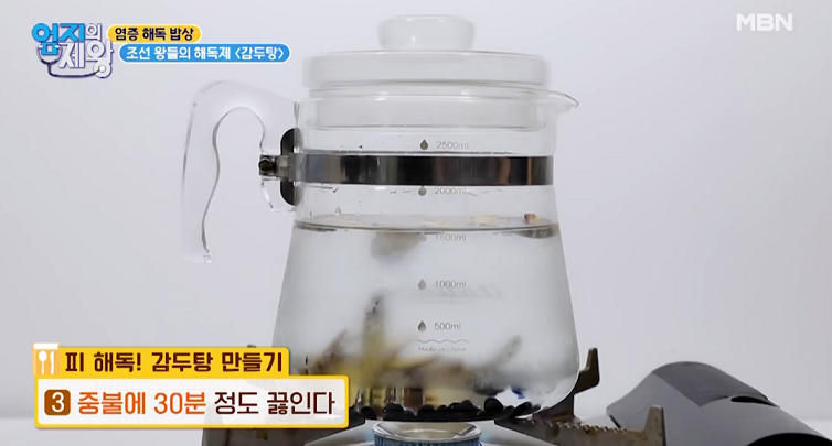감초 40g, 검은콩 40g, 물 2리터