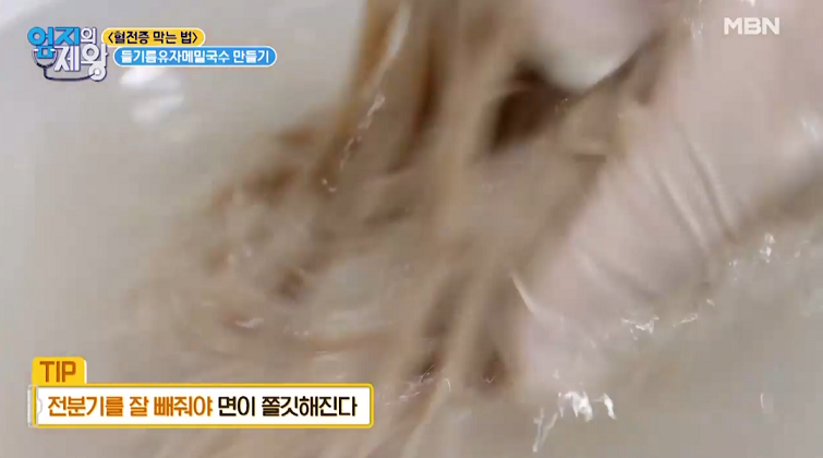 7. 메밀면은 끓는 물애 3분간 삶은 뒤 찬물에 씻는다.