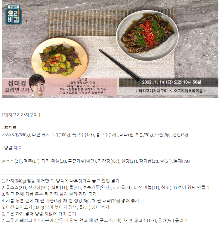 최고의 요리비결 정미경의 돼지고기가지구이와 소고기애호박볶음 레시피
