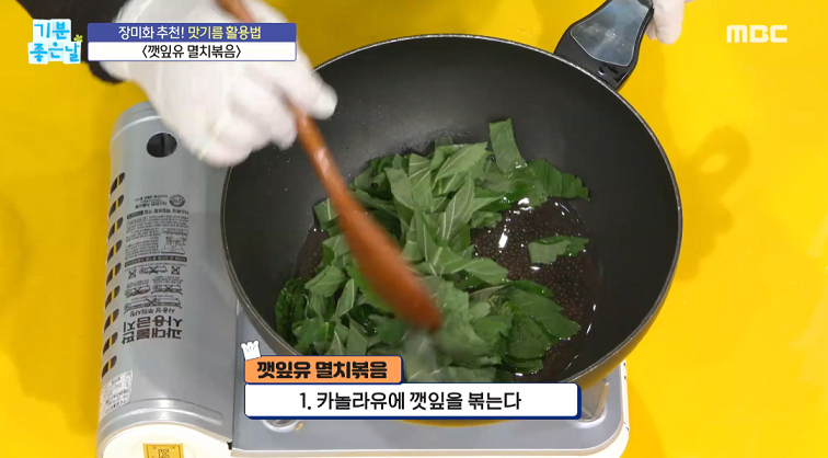 3. 깻잎유에 멸치를 넣고 볶는다.