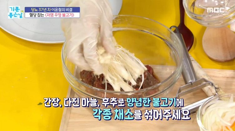 3. 간장, 다진마늘, 후추로 양념한 불고기에 각종 채소를 섞어준다.