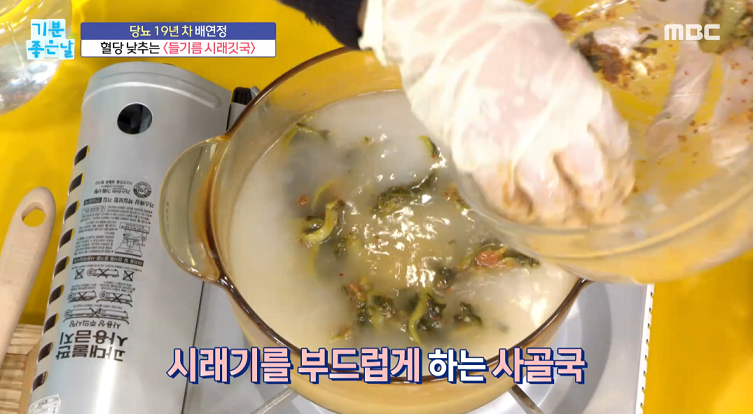 5. 시래기를 사골국물을 담은 냄비에 넣고 끓여 먹이면 끝.