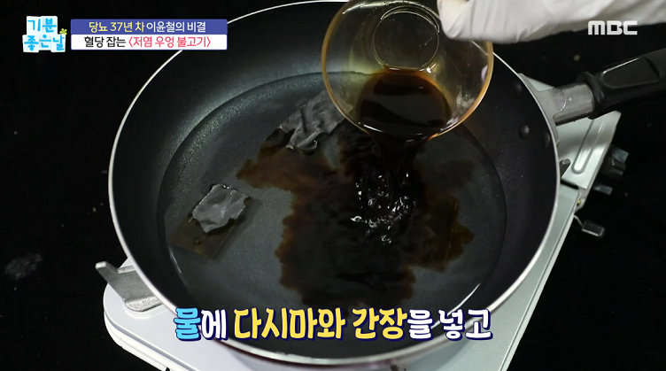 5. 냄비에 물 다시마와 간장을 넣는다.