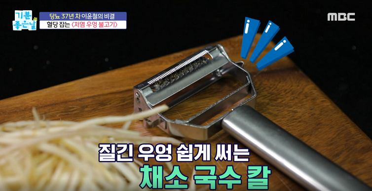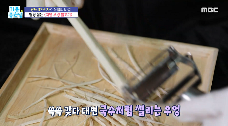 1. 질긴 우엉은 채소 국수 칼로 썬다.
