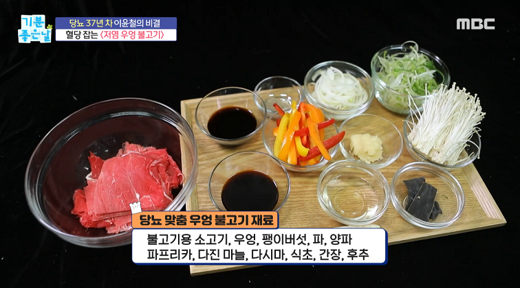 불고기용 소고기, 우엉, 팽이버섯, 파, 양파, 파프리카, 다진마늘, 다시마, 식초, 간장, 후추