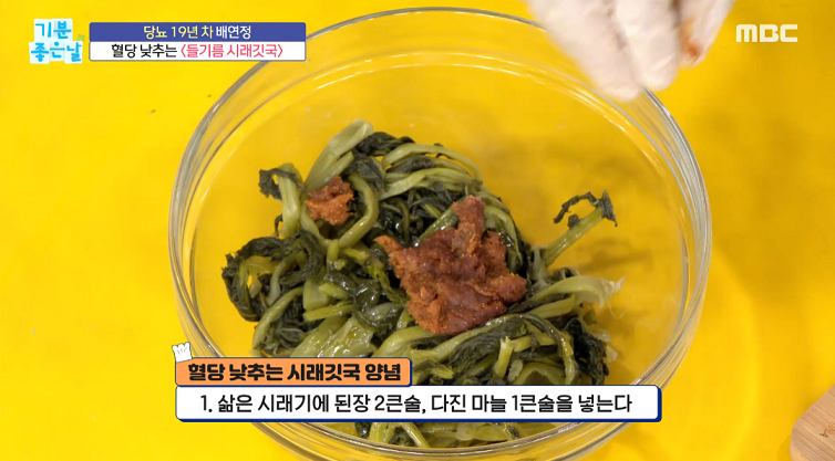 3. 삶은 시래기에 된장 2큰술, 다진마늘1큰술을 넣는다.