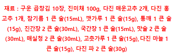 1. 직화로 구운 곱창김 10장을 4등분해서 자른 뒤, 비닐 봉투 안에 넣고 잘게 부순다.