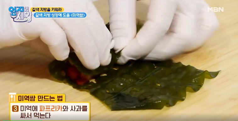 3. 미역에 파프리카와 사과를 싸서 먹는다.