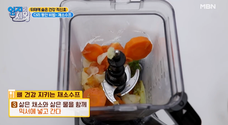 3.삶은 채소와 삶은 물을 함께 믹서에 넣고 간다.