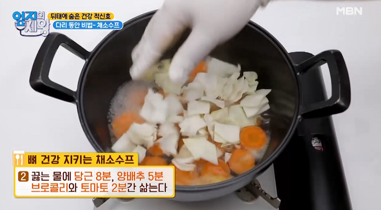 2. 끓는 물에 당근 8분, 양배추 5분, 브로콜리와 토마토 2분간 삶는다.