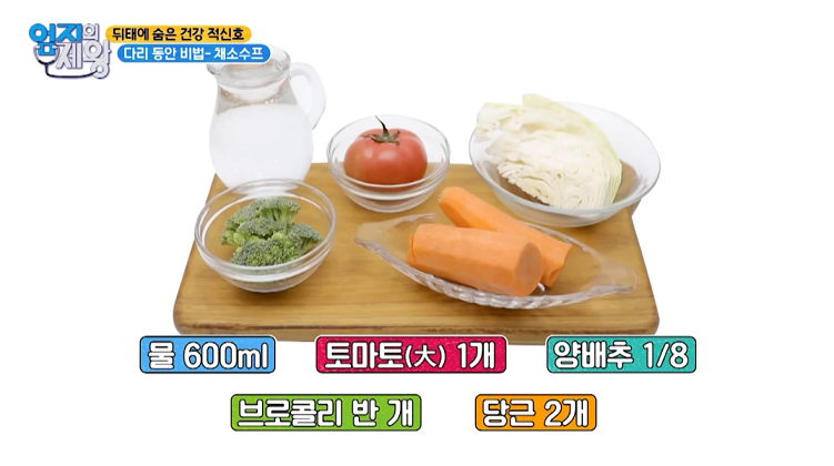 물 600ml, 토마토 1개, 양배추 1/8개, 브로콜리 반 개, 당근 2개