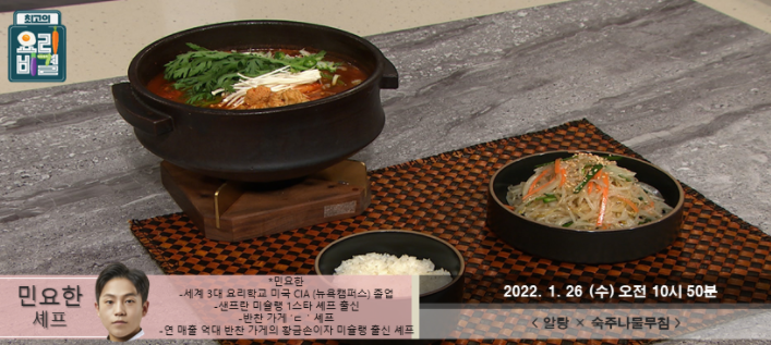 | 최고의 요리비결 민요한의 차돌된장찌개와 보쌈 레시피 (0) | 2022.01.22 |