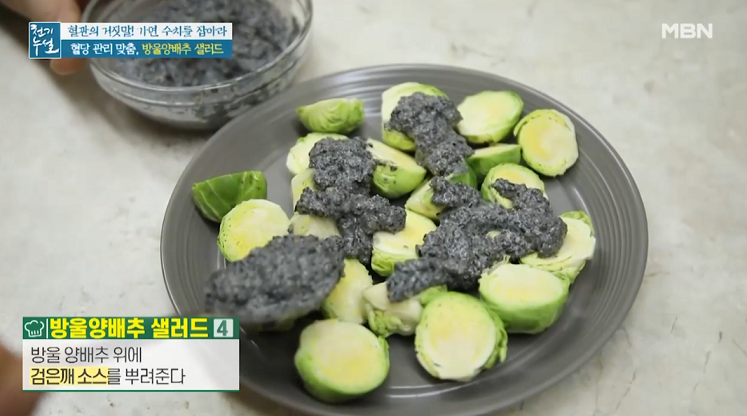 4. 방울 양배추 위에 검은깨 소스를 뿌려준다.