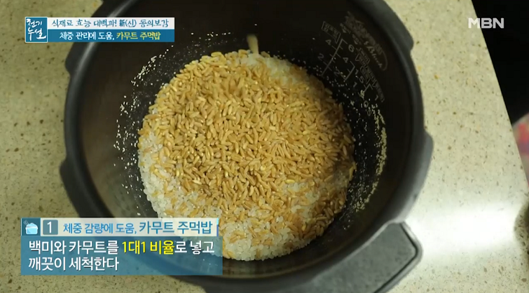 2. 카무트는 물을 적게 흡수하는 특징이 있으니 평소보다 밥물을 적게 넣는다.